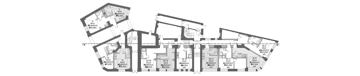 Izpēti “Pastnieku nama” dzīvokļu plānojumus un atrodi sev vēlamo iegādei. Pieejami studio tipa dzīvokļi platībā no 15 līdz 25 m² un divistabu (vienas guļamistabas dzīvokļi) platībā no 30 līdz 40 m².
