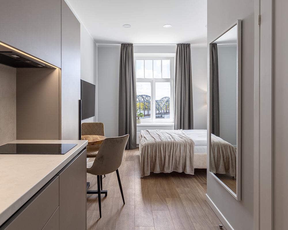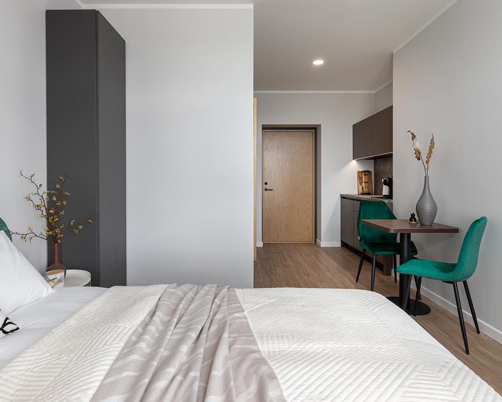 “Pastnieku namā” pieejami 86 pilnībā mēbelēti un aprīkoti studio tipa dzīvokļi platībā no 15 līdz 30 m². Dzīvokļi būs lieliski piemēroti izīrēšanai īstermiņā vai izīrēšanai studentiem, pat neskatoties uz to, ka ēkā nav pieejams lifts.