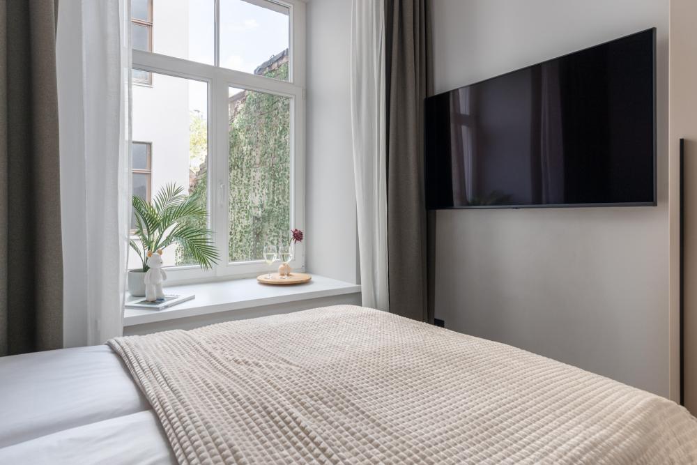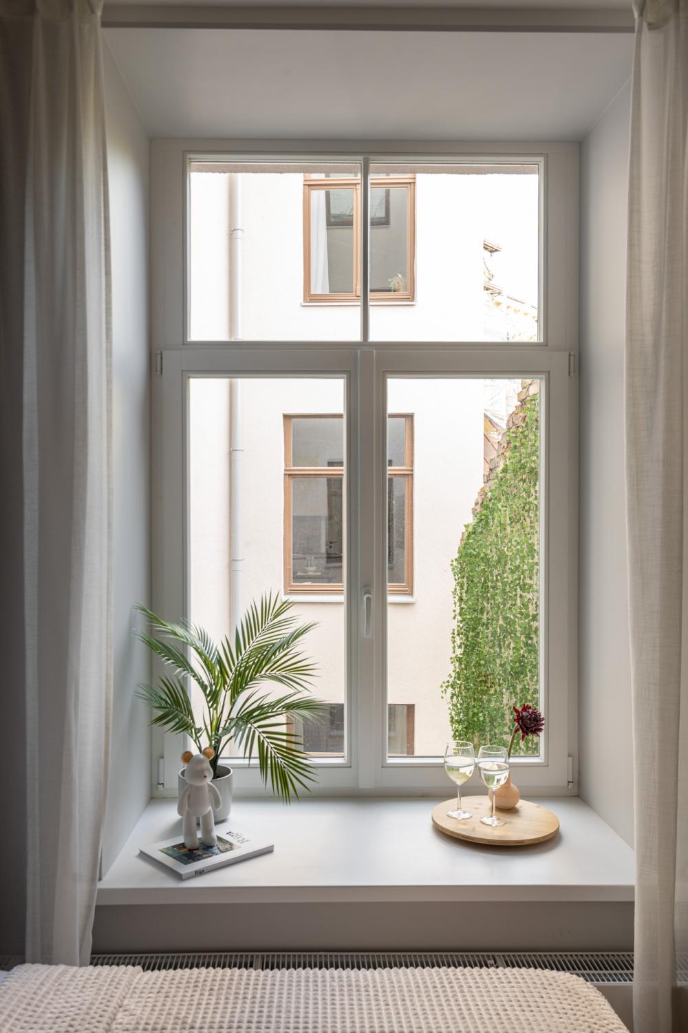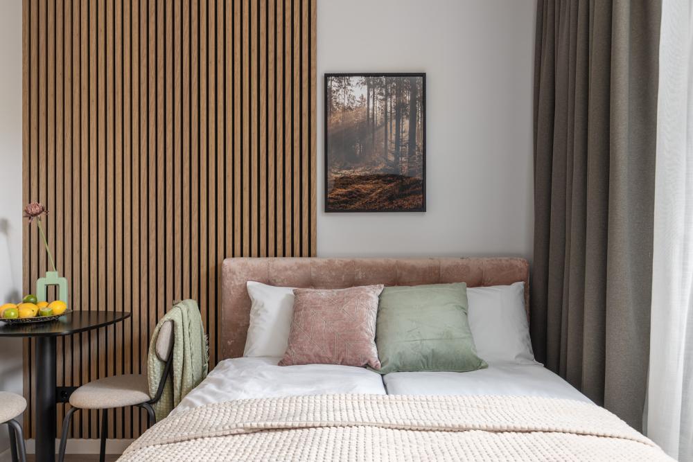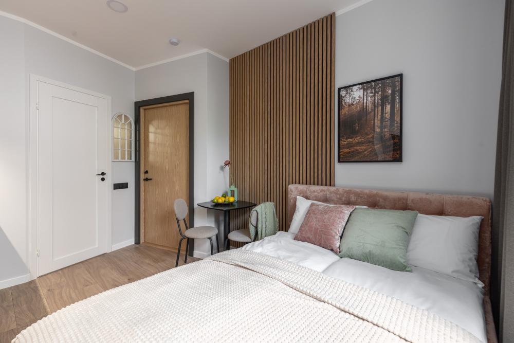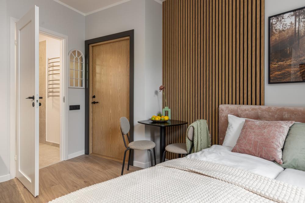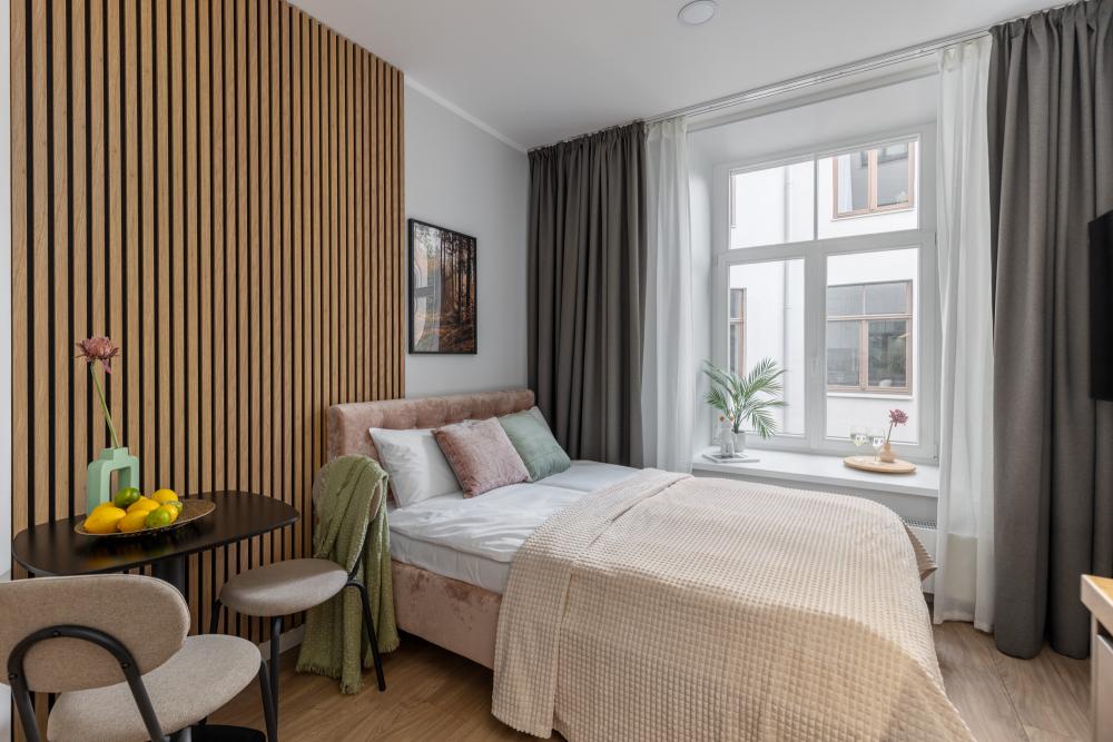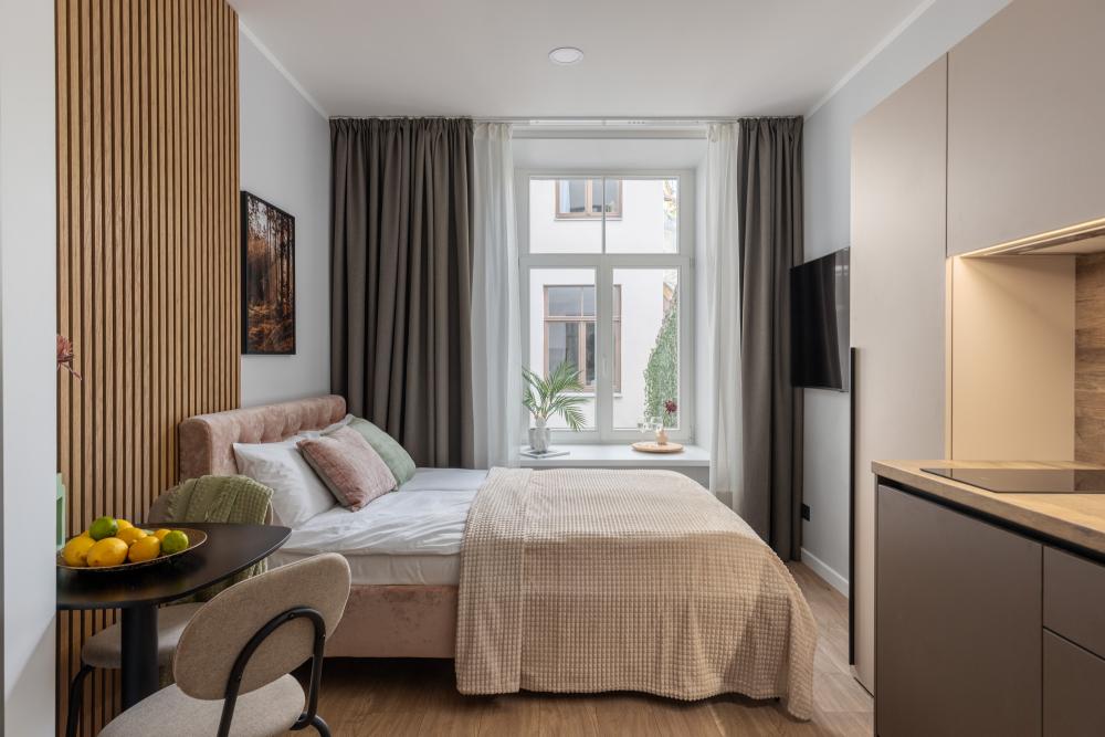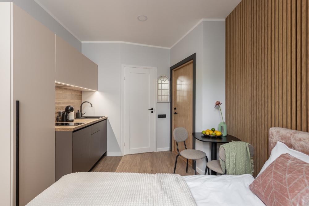 Gaišs, moderns un pilnībā aprīkots studio tipa dzīvoklis ar skatu uz Daugavu. Interjerā izmantotas mēbeles un virtuves iekārtas, kas ražotas Latvijā. Dzīvokļi pieejami platībā no 15 līdz 30 m².