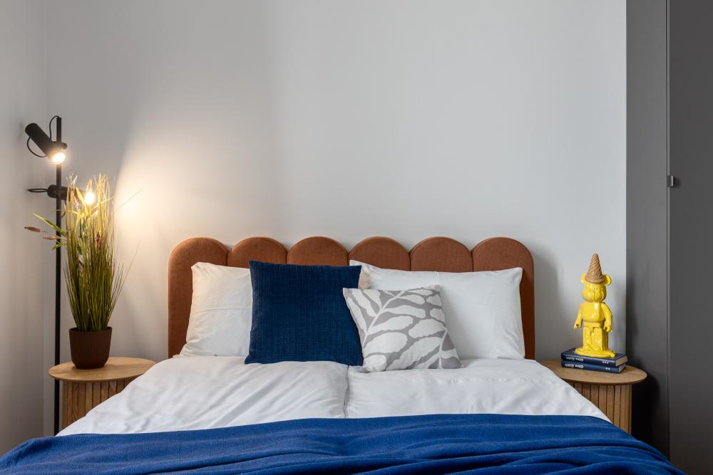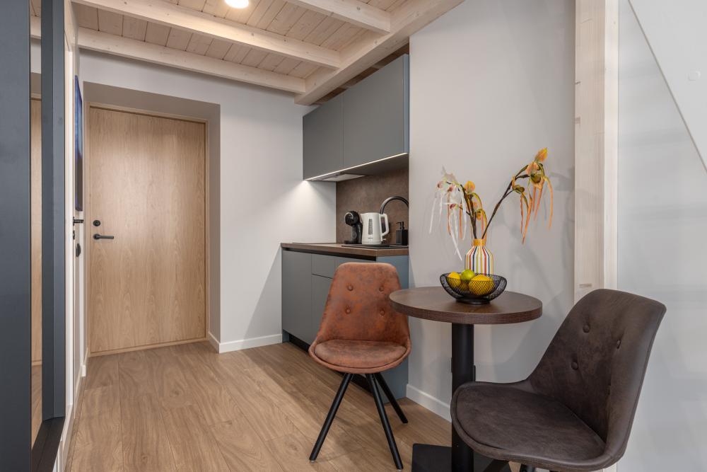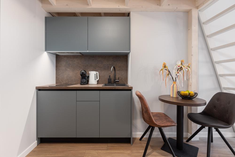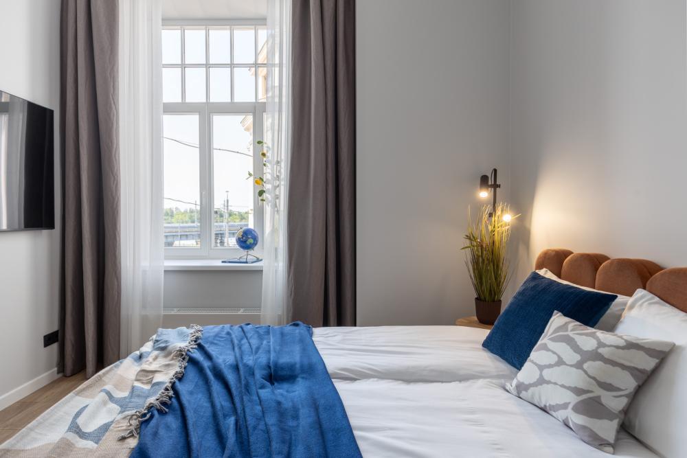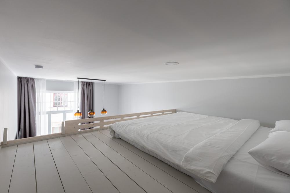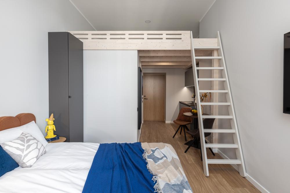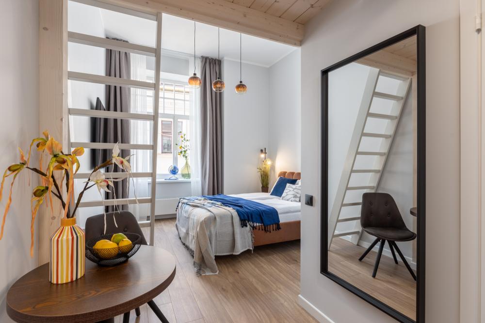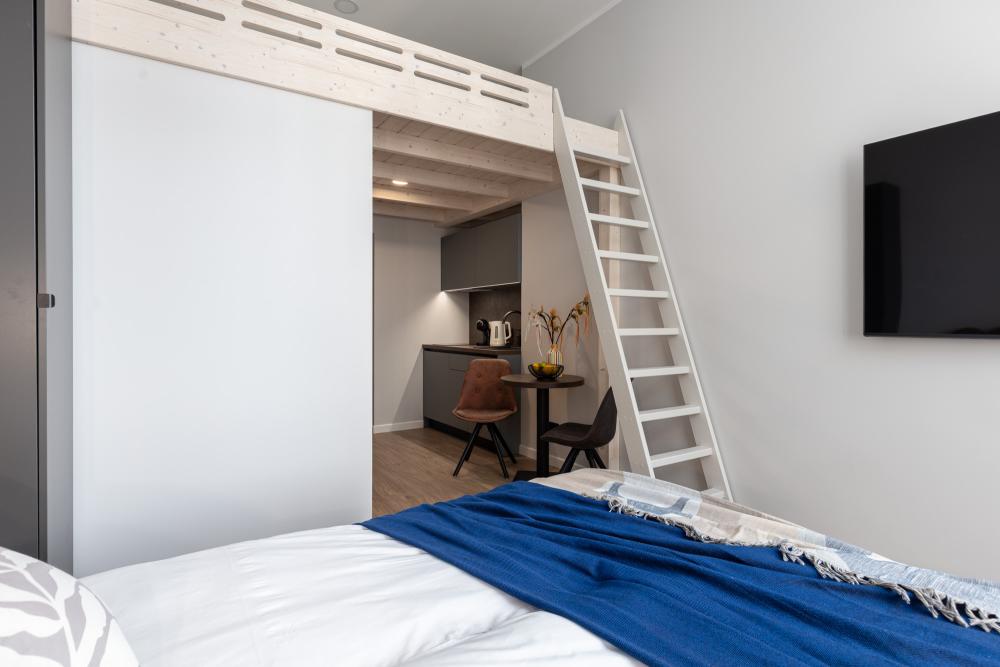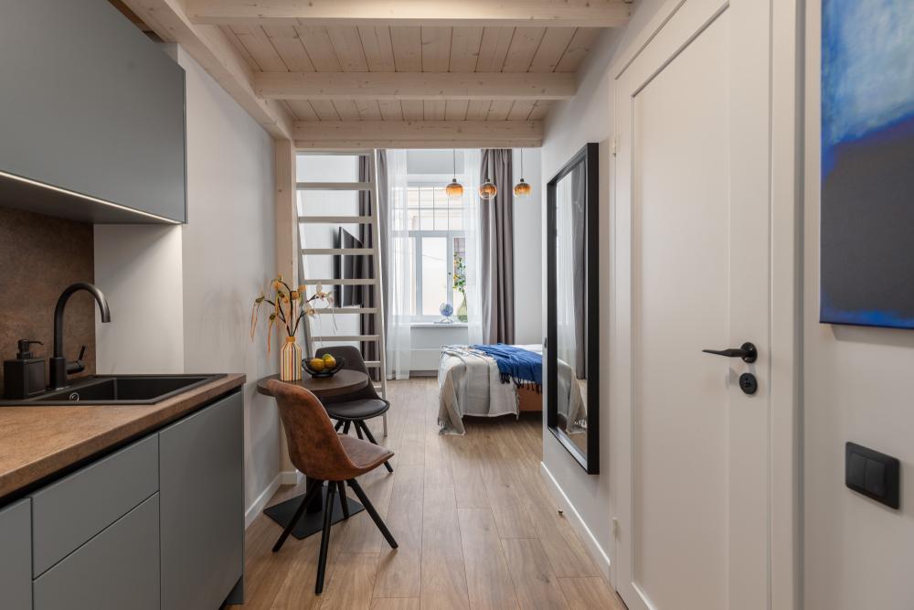 Gaišs, moderns un pilnībā aprīkots studio tipa dzīvoklis ar skatu uz Daugavu. Interjerā izmantotas mēbeles un virtuves iekārtas, kas ražotas Latvijā. Dzīvokļi pieejami platībā no 15 līdz 30 m².