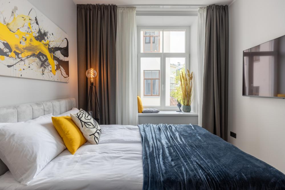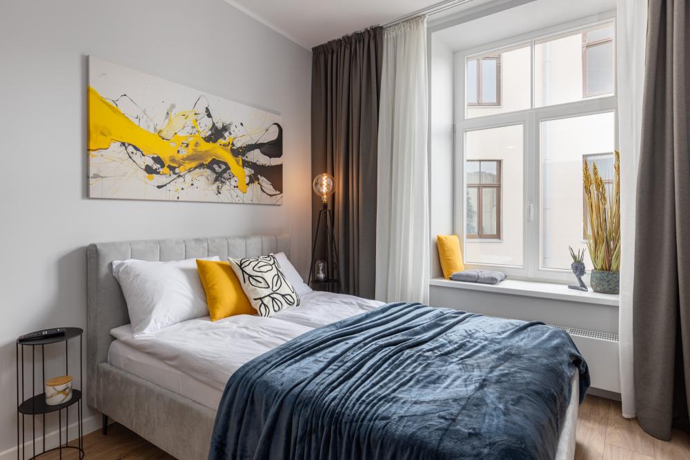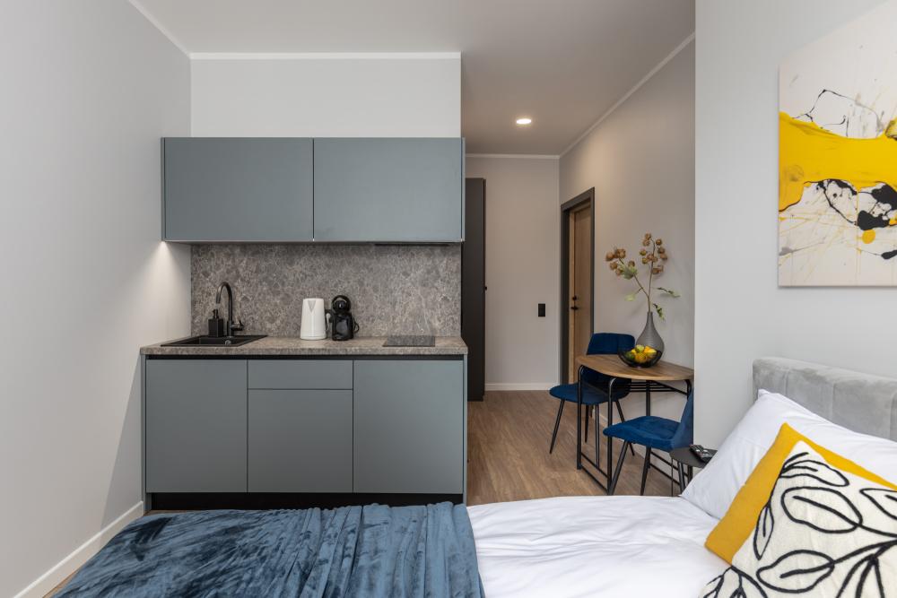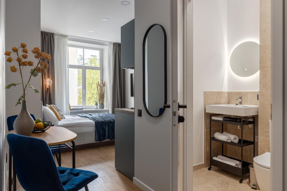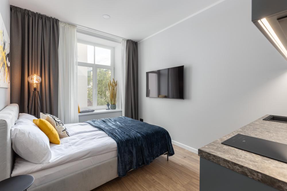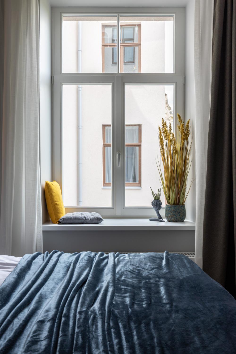 Gaišs, moderns un pilnībā aprīkots divistabu dzīvoklis ar skatu uz “Pastnieku nams” iekšpagalmu. Interjerā izmantotas mēbeles un virtuves iekārtas, kas ražotas Latvijā. Dzīvokļi pieejami platībā no 30 līdz 45 m².