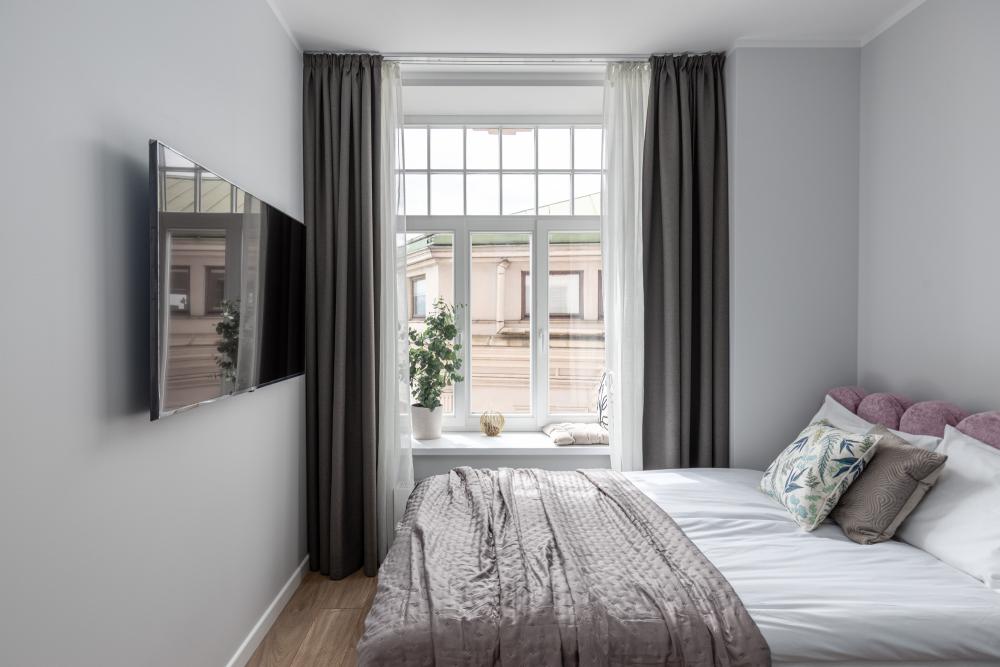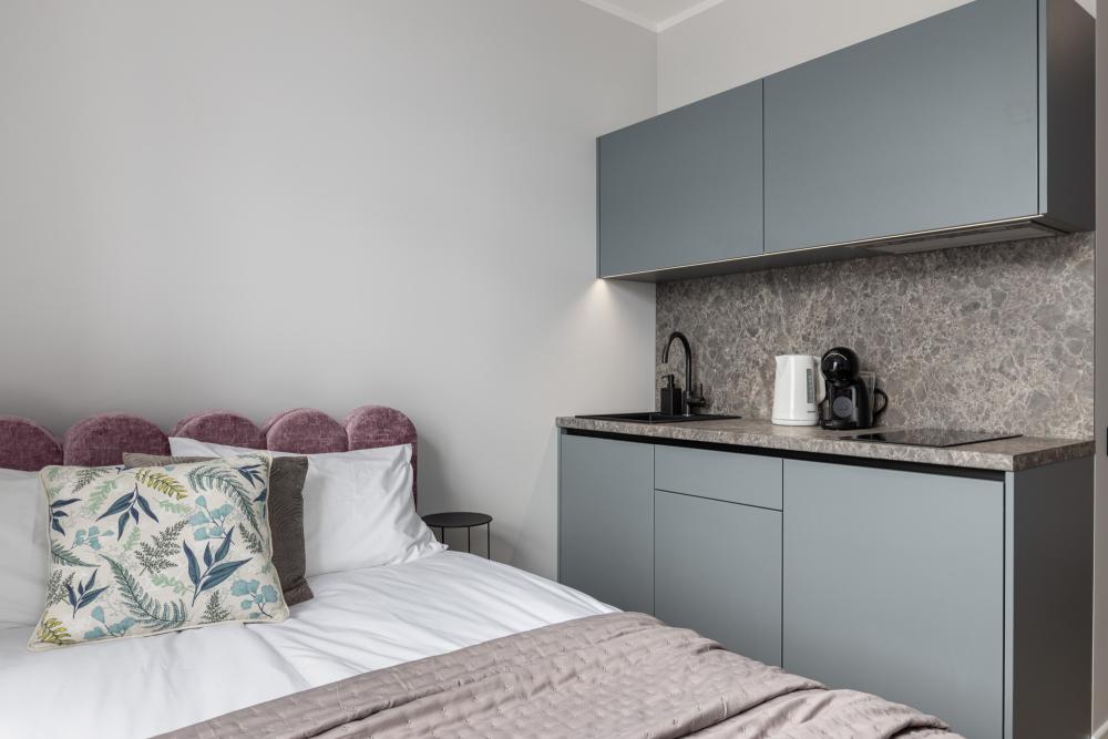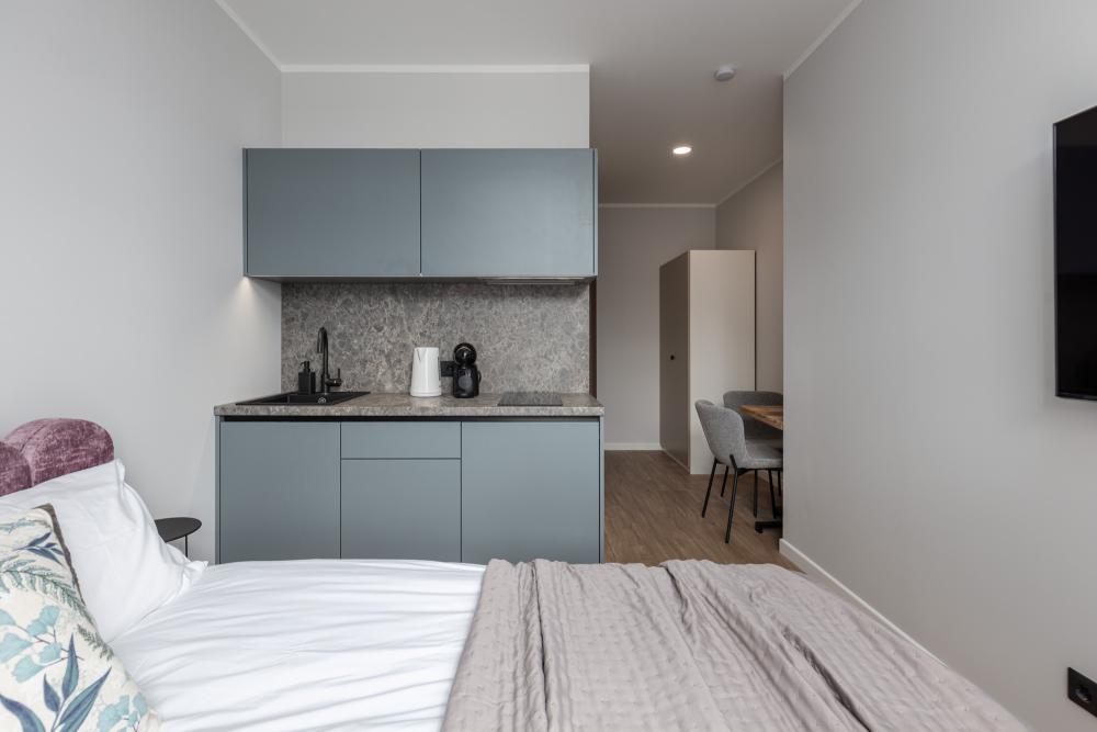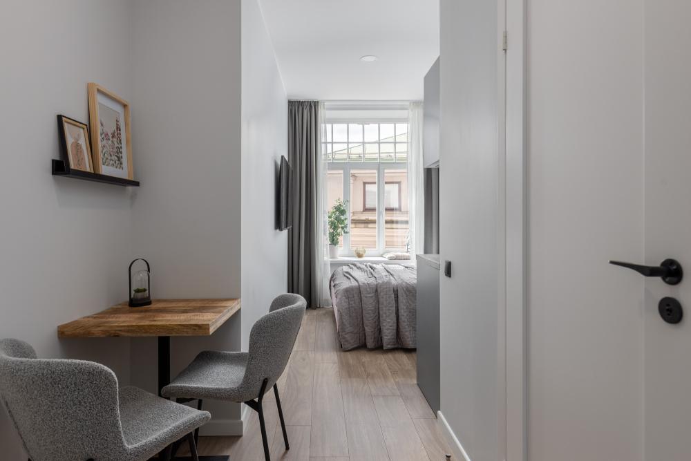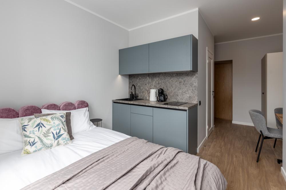 Gaišs, moderns un pilnībā aprīkots studio tipa dzīvoklis ar skatu uz Daugavu. Interjerā izmantotas mēbeles un virtuves iekārtas, kas ražotas Latvijā. Dzīvokļi pieejami platībā no 15 līdz 30 m².
