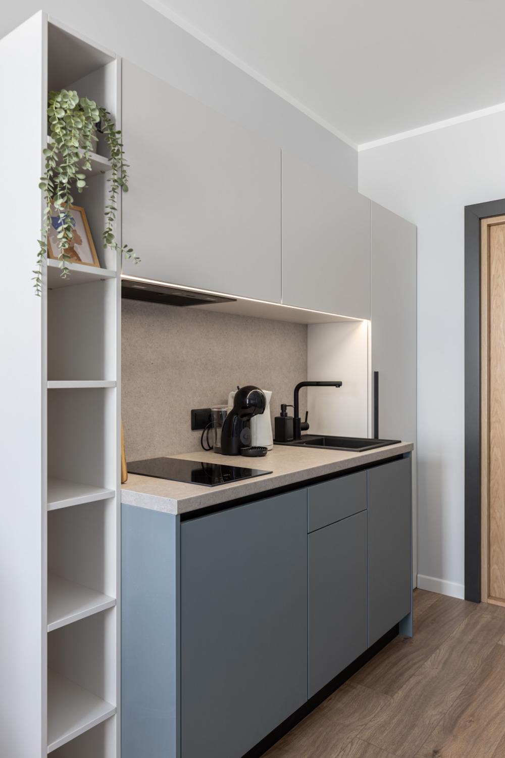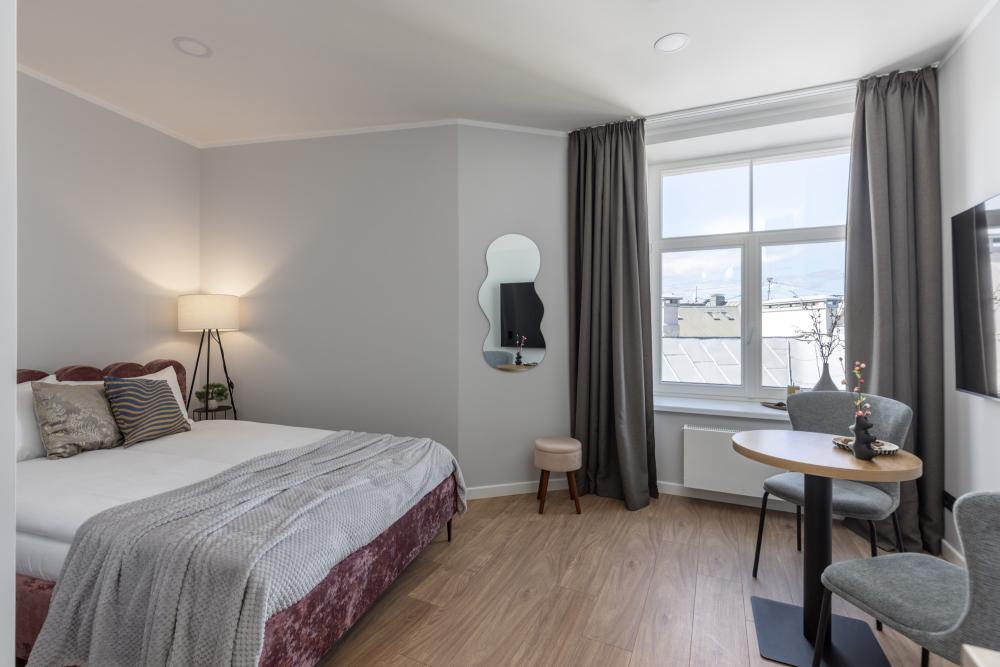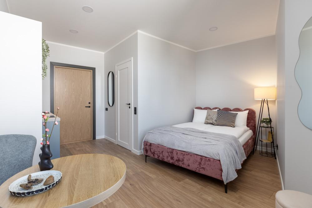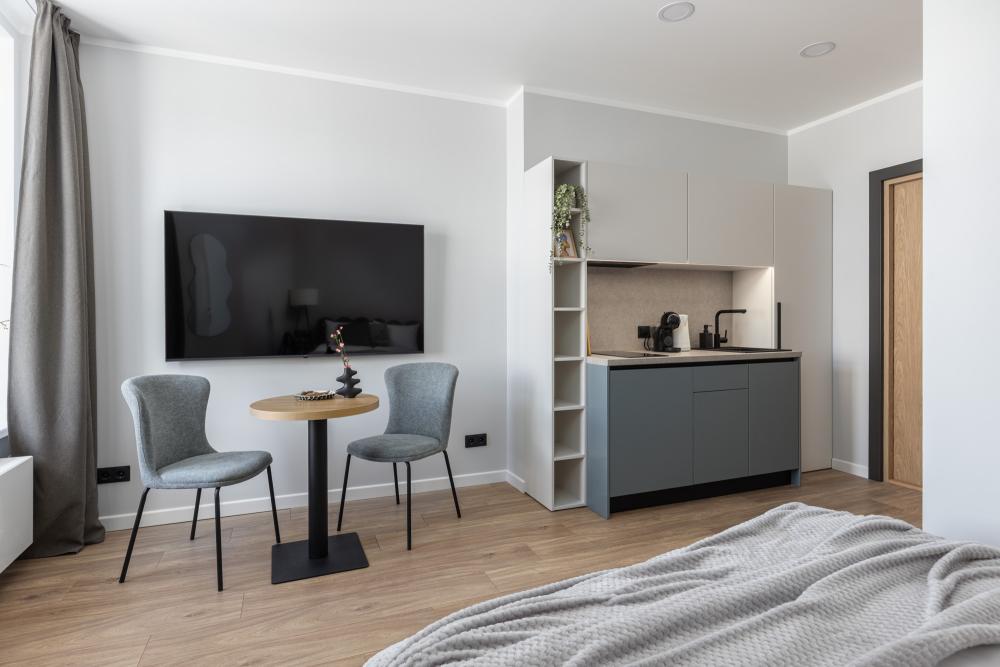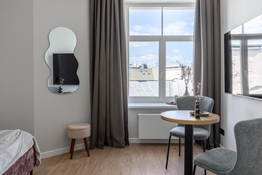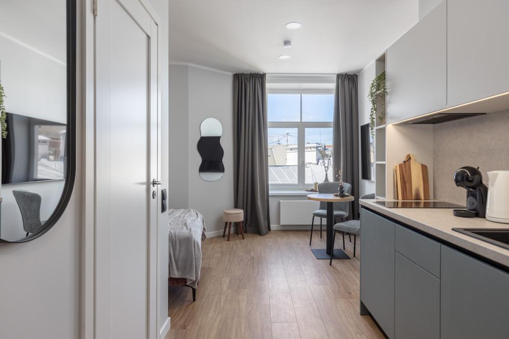 Gaišs, moderns un pilnībā aprīkots studio tipa dzīvoklis ar skatu uz Daugavu. Interjerā izmantotas mēbeles un virtuves iekārtas, kas ražotas Latvijā. Dzīvokļi pieejami platībā no 15 līdz 30 m².