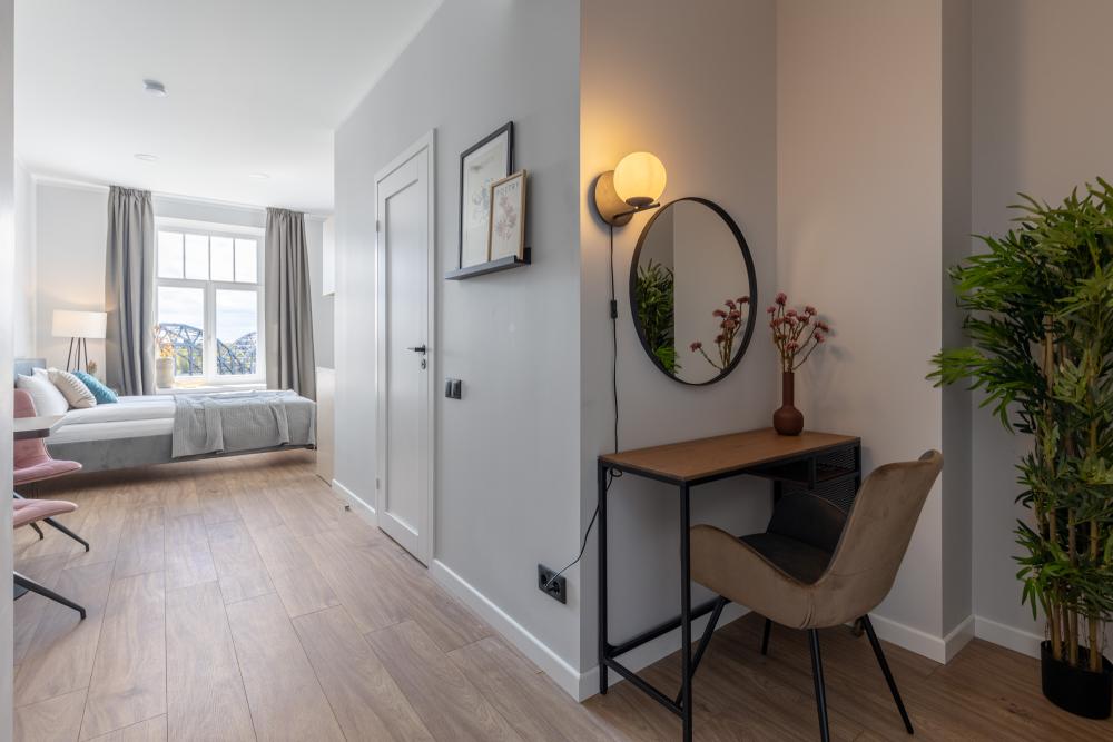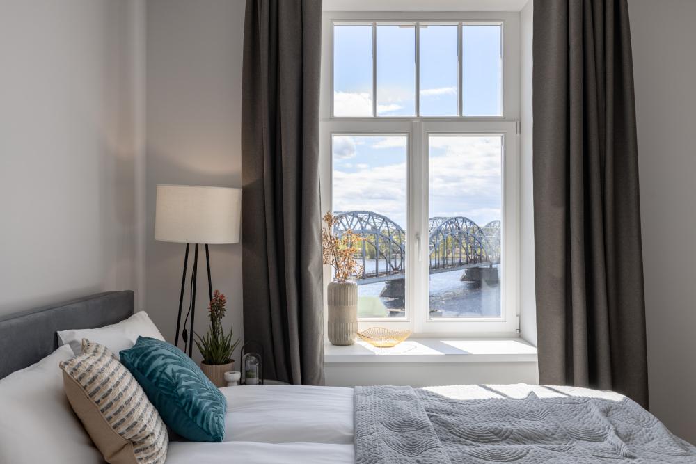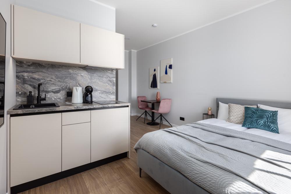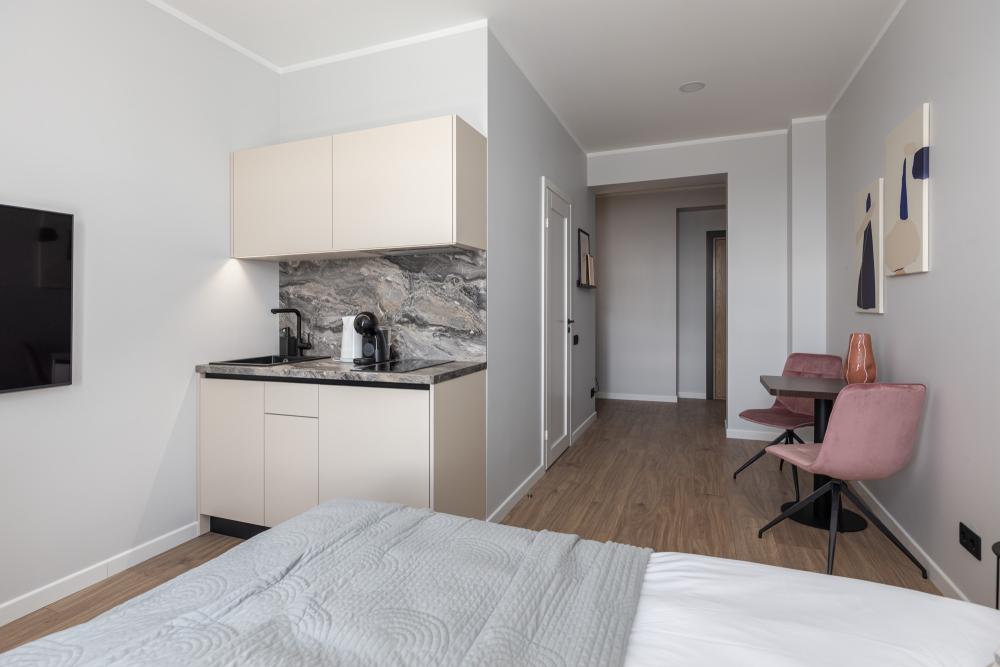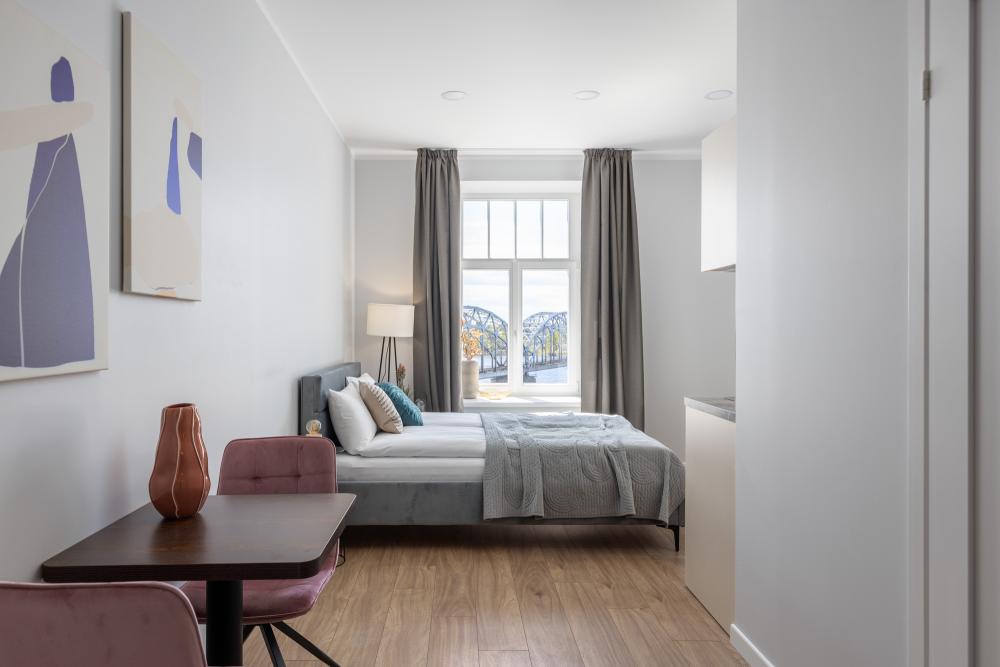Gaišs, moderns un pilnībā aprīkots studio tipa dzīvoklis ar skatu uz Daugavu. Interjerā izmantotas mēbeles un virtuves iekārtas, kas ražotas Latvijā. Dzīvokļi pieejami platībā no 15 līdz 30 m².
